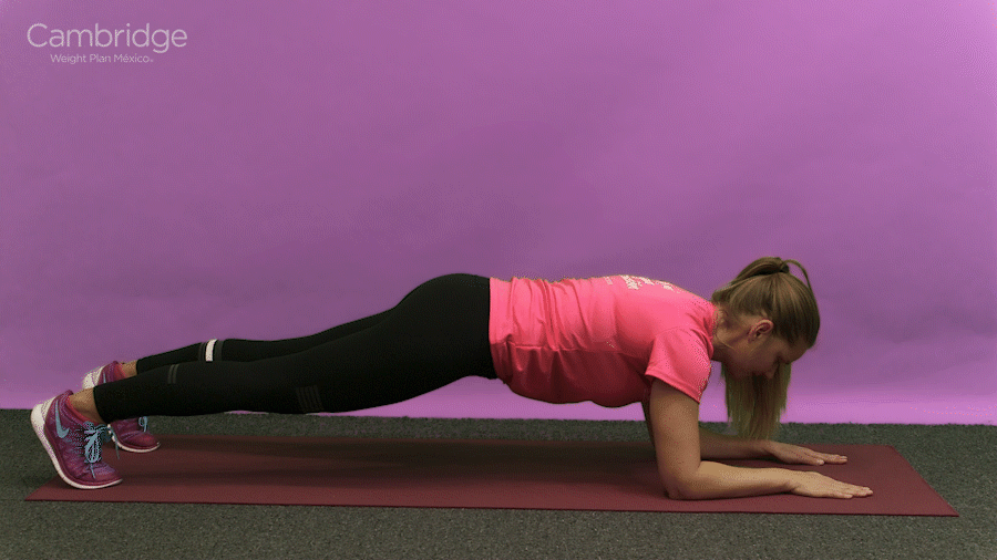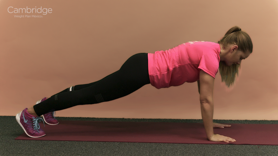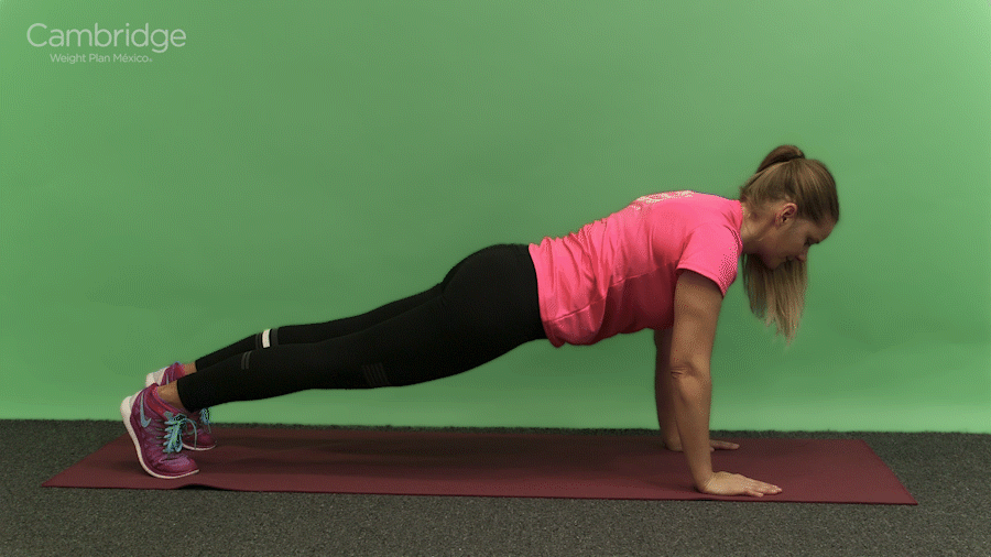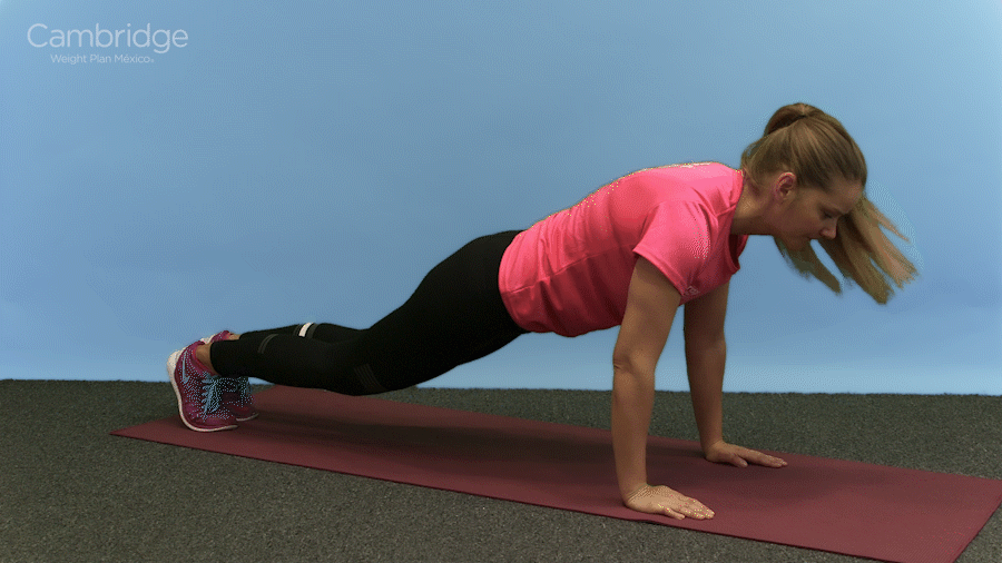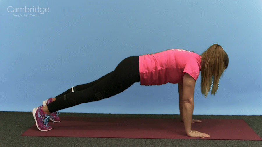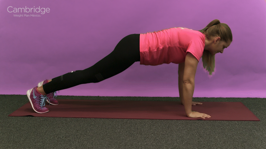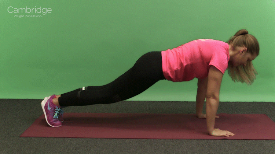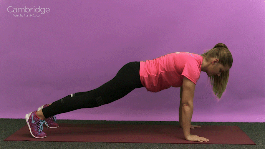 Comienza en posición de tabla alta con tus hombros por encima de tus muñecas y tus abdominales contraídos.